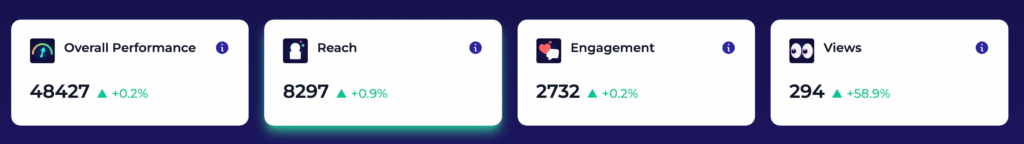 Open the Hub for an instant read on what matters. Filter by Organic, Paid, or Combined, pick your content source and timeframe, then see top and worst performers, score shifts over time, and your key scores at a glance: Overall Performance, Reach, Engagement, and Views. Trend graphs make spikes and dips obvious so you know what to scale, refresh, or retire—fast.